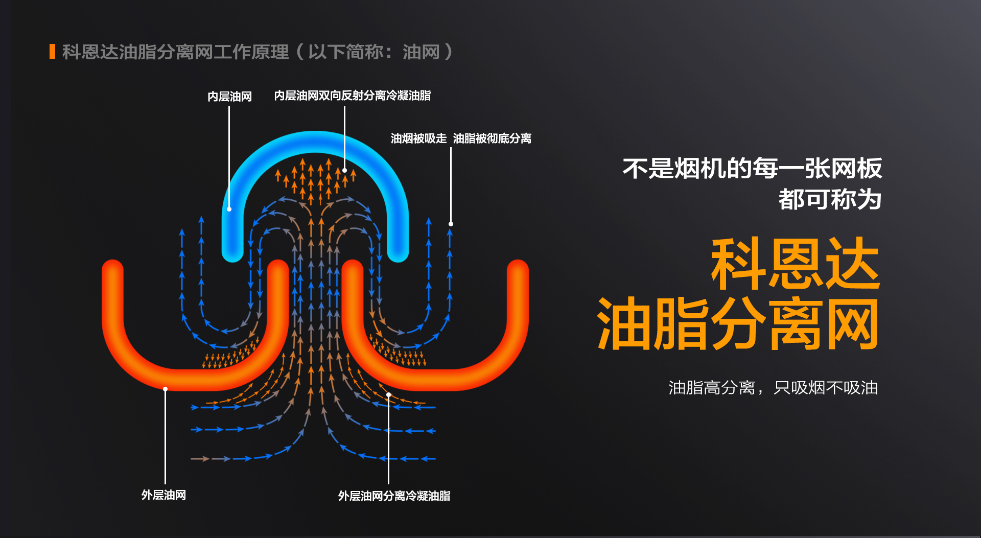 2. 在應用“科恩達平網”的情況下,油煙在升騰、炸開、擴散的過程中與單組的進氣口和出氣口在同一軸線上,油煙分子被有序迅速吸走。