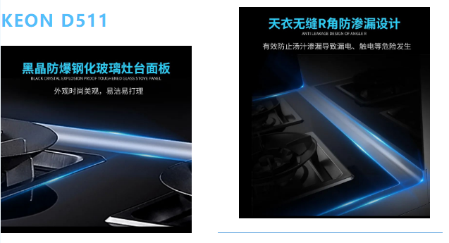 灶臺面板采用黑晶防爆鋼化玻璃,三重防護臺面:鋼化玻璃+防爆膜+防爆鋼板,防爆防燙更易打理,搭配熱電偶熄火保護裝置,遇意外快速切斷氣源電源。