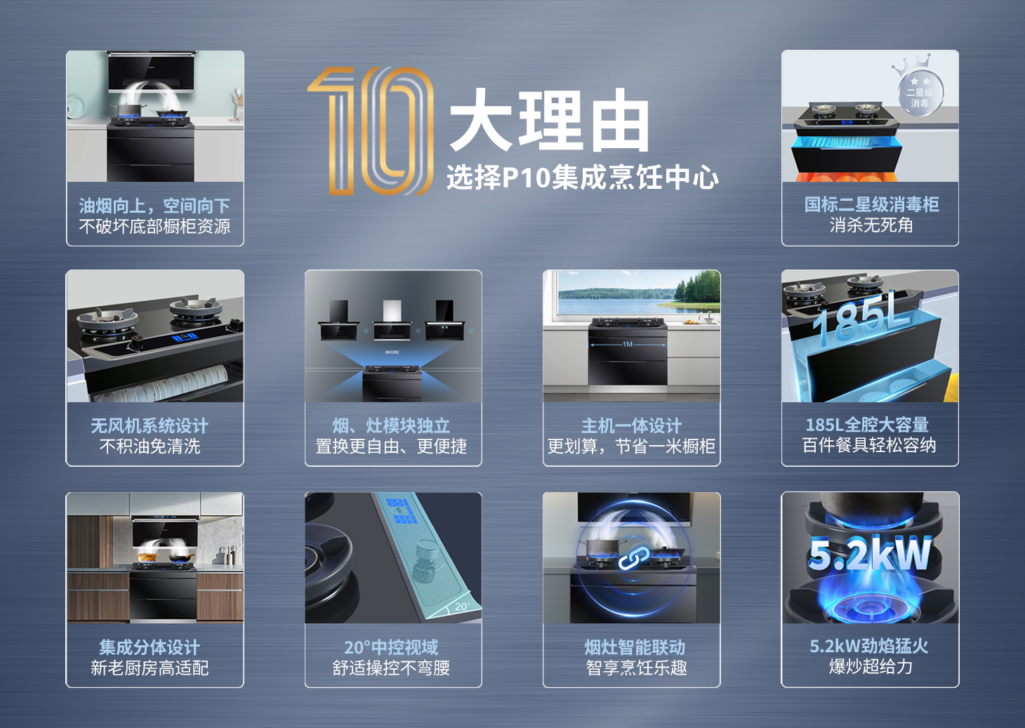 產(chǎn)品型號(hào):烹飪中心P10(大雙抽消灶款)產(chǎn)品名稱:集成烹飪中心(消+灶款)